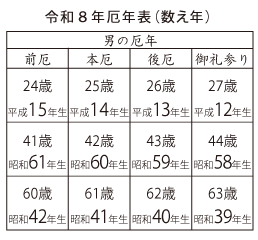 身曾岐神社では、本年が厄年にあたられる(下に一覧表が掲げてあります。)のであれば、